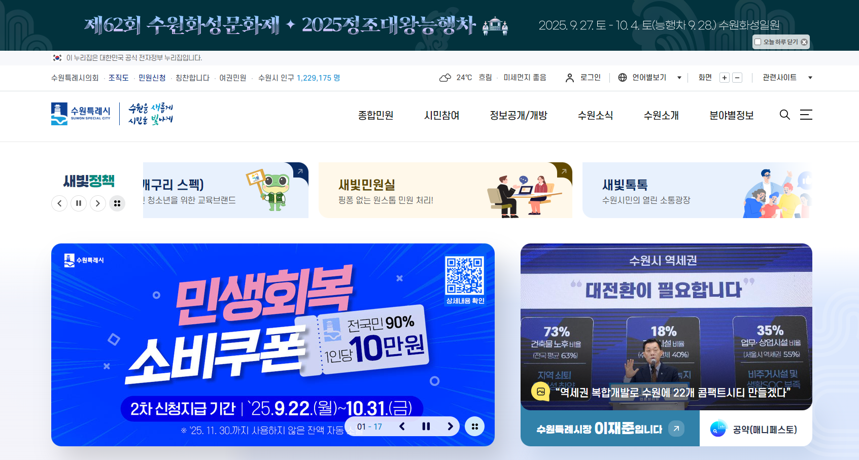 | 웹사이트 설명 | 수원시 홈페이지는 120만 시민과 함께 성장해 온 시민과 행정을 연결하는 공식 온라인 창구로서, 행정 서비스와 시민 소통의 중심 채널 역할을 수행하고 있습니다. 본 홈페이지는 단순한 정보 제공을 넘어, 시민과 행정이 함께 호흡하는 디지털 거버넌스의 장으로 발전해 왔습니다.