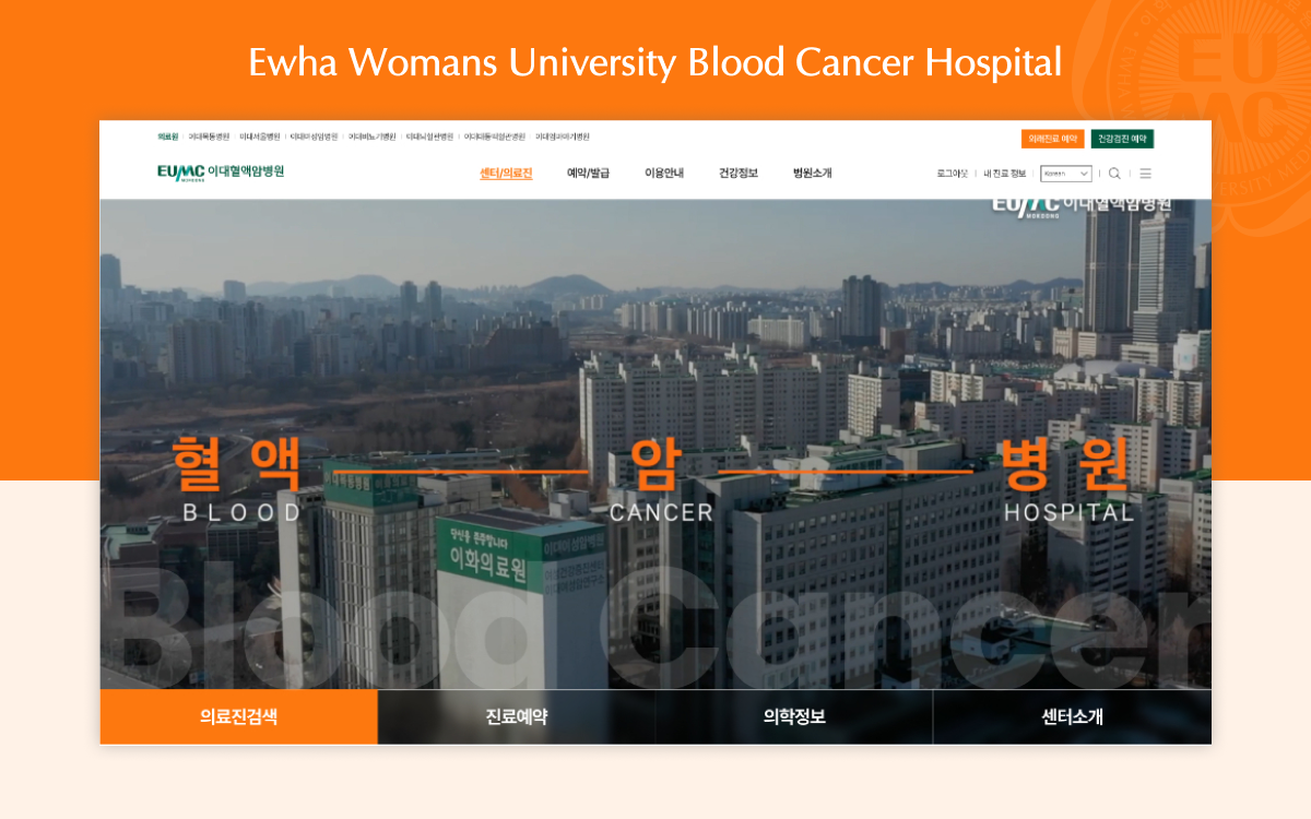 2025년 3월 개원한 이대혈액암병원의 방문자들이 쉽고 빠르게 의료서비스를 받을 수 있도록 사용자 중심의 홈페이지를 구축하였습니다. 이대혈액암병원의 아이덴티티를 확립하고 EMR 연동을 통한 실시간 온라인 진료예약 등 IT 기술을 접목하여 환자들에게 신뢰봗는 의료정보포털로 자리매김하였습니다. [디자인 및 UI/UX] 주조색으로는 주황, 보조색으로는 초록을 사용하여 희망적인 에너지와 따뜻한 희망의 이미지를 전달하여 환자들의 회복 여정을 함께하는 이대혈액암병원의 정체성을 표현했습니다. 와이드 레이아웃 기반의 반응형 웹 디자인으로 다양한 기기에서 일관된 시각적 경험을 제공하며 넓은 화면을 활용한 효과적인 정보 전달을 통해 사용자 만족도를 극대화했습니다. 메인 화면에 이대혈액암병원의 차별화된 특징을 나타내어 홈페이지 사용자들에게 병원에 대한 신뢰도를 향상시켜주며 스크롤·마우스 이동 시 발생하는 다양한 인터랙션 효과를 통해 사용자의 흥미와 몰입도를 극대화 시켜 차별화된 경험을 제공하였습니다. [차별화 서비스] 센터/의료진의 하위 메뉴인 '진료시간표'에서 이대혈액암병원을 대표하는 의료진들의 주간 일정을 한눈에 확인하고 바로 예약할 수 있습니다. 또한 의료진 프로필 화면에서는 해당 의료진의 월간 진료 일정과 예약 가능 일자가 함께 제공되어 사용자가 손쉽게 진료 일정을 확인하고 예약으로 연결될 수 있도록 구성하였습니다. 아울러 외국인 환자를 위한 영어, 러시아어, 몽골어, 아랍어, 중국어를 지원하는 다국어 홈페이지를 함께 구축하여 이대혈액암병원에 대한 소개와 안내가 원활히 이루어지도록 하였습니다. [진료 예약 서비스] EMR 연동을 통한 실시간 온라인 진료예약을 도입하여 사용자들이 장소와 시간에 제약 없이 예약 및 예약 변경, 취소 등 홈페이지에서 간편하게 처리할 수 있도록 설계하였습니다. 진료 예약은 센터 소개, 의료진 목록, 의료진 프로필 화면 등 다양한 경로에서 바로 연결되어 접근성과 편리성을 대폭 향상시켰습니다. 또한 회원가입 기능을 도입해 이대혈액암병원 사용자들의 개인화 서비스 기능을 강화했습니다. 마이페이지에서 진료 및 검사 내역, 예약 내역 등을 확인할 수 있고 예약 변경, 취소가 필요한 경우 별도의 복잡한 절차 없이 마이페이지 내에서 바로 처리가 가능합니다. |