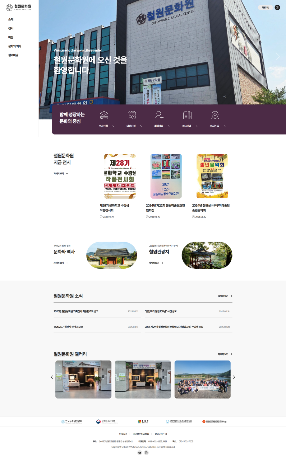 | 웹사이트 설명 | 철원문화원 홈페이지는 지역 문화와 역사적 가치를 효과적으로 전달하고, 다양한 문화 프로그램과 참여 기회를 제공하는 종합적인 온라인 플랫폼입니다. 홈페이지는 전시 및 시설 대관 서비스를 통해 철원문화원의 전시 공간과 대관을 쉽게 예약하고 이용할 수 있도록 지원합니다. 현재 전시와 관련된 정보를 실시간으로 업데이트하여 방문객들이 다양한 문화적 경험을 즐길 수 있도록 도와줍니다.