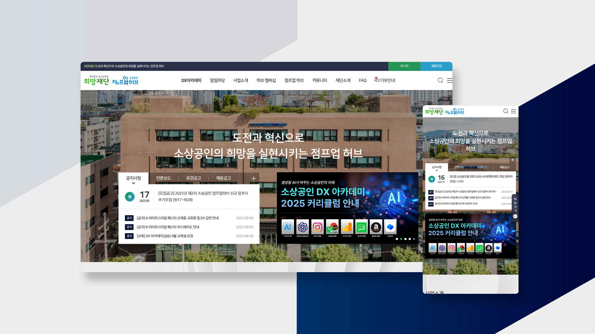 중소상공인희망재단은 소상공인과 중소기업의 지속가능한 성장을 지원하는 비영리 공익재단으로, 홈페이지는 다양한 지원사업과 정보를 통합적으로 제공하는 소통의 허브 역할을 수행합니다. 사용자 중심의 설계와 직관적인 UI를 통해 누구나 쉽게 필요한 정보를 탐색하고 서비스를 신청할 수 있도록 제작되었습니다. [구축 목적] 재단의 설립 취지와 주요 사업을 국민에게 알리고 신뢰도를 제고 중소상공인 대상 교육, 판로지원, 창업보육 등 다양한 지원사업을 안내하고 참여 유도 정책 소식, 공지사항, 자료실 등 공공정보를 투명하게 제공하여 이용자의 접근성과 편의성 강화 [주요 콘텐츠 및 기능] 사업 소개: 교육사업, 판로지원사업, 창업보육사업 등 테마별로 분류하여 이용자가 쉽게 접근 가능 공지사항 및 공고: 최신 사업 공고 및 지원 일정 안내 자료실: 사업 신청서, 보고서, 정책자료 등 다운로드 가능 모바일 최적화: 다양한 디바이스에서 최적의 사용 경험 제공 (반응형 웹) 접근성 강화: 고령층 및 비전문가도 쉽게 이용할 수 있도록 텍스트 중심의 간결한 구조와 명확한 내비게이션 구성 신청 시스템 연동: 각종 사업 참여 신청 및 문의 기능 제공 [디자인 콘셉트] 공공성과 신뢰감 강조: 화이트 기반의 클린 디자인과 신뢰감 있는 블루 계열 컬러 사용 정보 중심 구조: 사용자 눈높이에 맞춘 메뉴 구성과 명확한 정보 아키텍처 설계 가독성 높은 UI/UX: 텍스트 위주의 콘텐츠 배치와 시각적 피로도를 줄이는 구성 [사용자 중심의 특징] 사용자 유형(소상공인, 창업자, 일반 국민 등)에 따라 필요한 정보를 빠르게 찾을 수 있도록 설계 접근성을 고려한 폰트 크기, 대비율, 모바일 사용성 강화 향후 온라인 상담, 신청 결과 확인 등 디지털 행정 기능 확장 예정 |