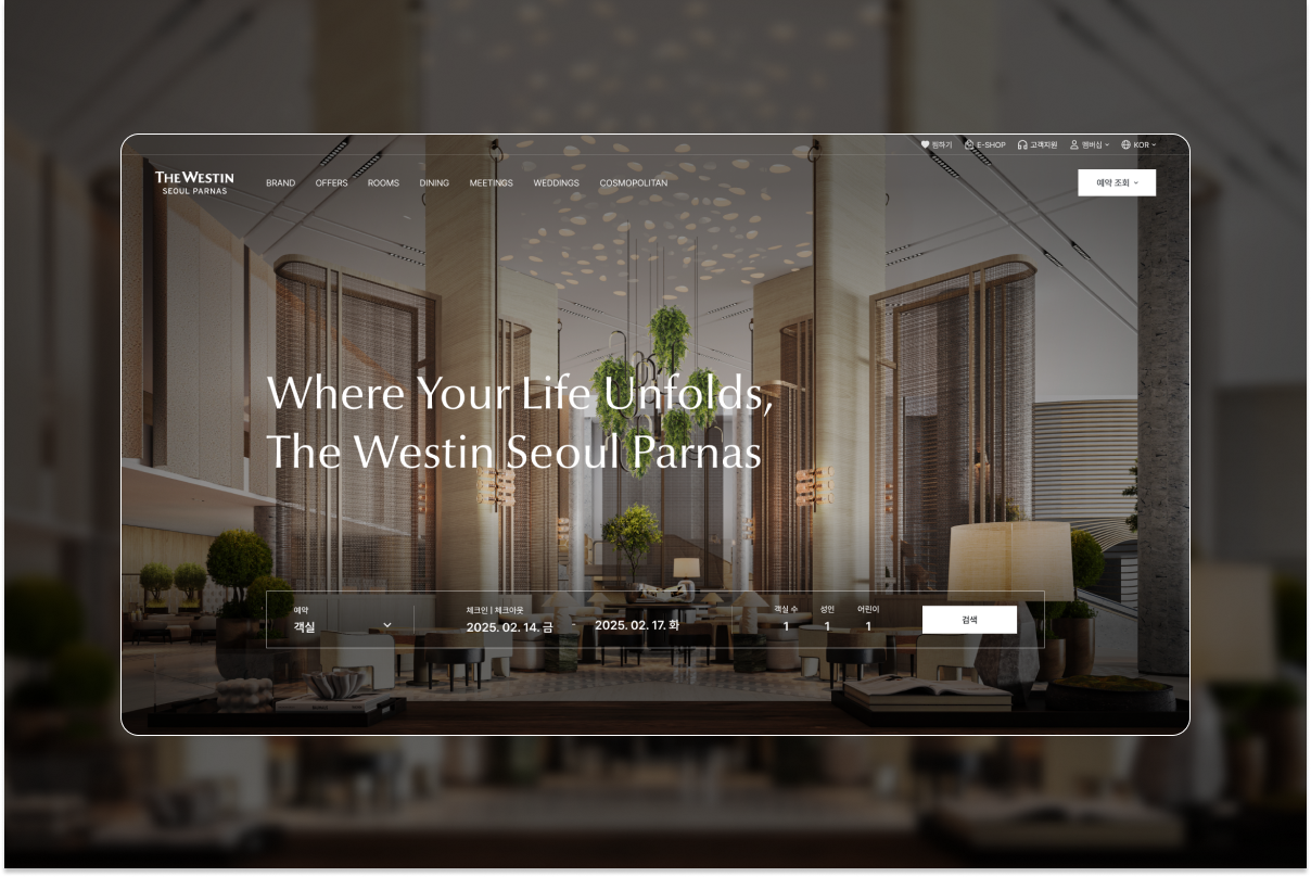절제된 컬러와 정돈된 타이포그래피를 적용했습니다. 각 섹션은 공간의 리듬을 반영해 구성되었으며, 페이지 이동과 스크롤 과정에서도 자연스러운 흐름을 제공합니다. 명확한 정보 구조와 간결한 이동 동선을 중심으로 UI/UX를 설계했습니다. 객실, 다이닝, 웨딩, 미팅 & 이벤트, 시설 등 주요 메뉴를 직관적으로 배치해 사용자가 필요한 정보를 빠르게 확인할 수 있도록 했습니다. 스크롤 기반의 인터랙션과 끊김 없는 전환 구조를 적용해 탐색 과정의 피로도를 줄였습니다. 콘텐츠는 단순한 정보 전달을 넘어 브랜드의 분위기를 함께 전합니다. 자연광을 닮은 이미지 톤과 여백 중심의 레이아웃을 사용해 사이트를 탐색하는 과정에서도 편안함을 느낄 수 있도록 구성했습니다. 웨스틴서울파르나스 공식 웹사이트는 단순한 안내 채널이 아닌, 브랜드 경험을 전달하는 디지털 플랫폼입니다. ‘머무는 동안의 회복과 재충전’이라는 핵심 메시지를 중심으로 시각적 구성과 사용자 경험을 하나로 연결했습니다. 방문자는 호텔의 시설과 서비스를 탐색하는 과정을 통해 오프라인의 감각을 온라인에서도 경험할 수 있으며, 이는 웨스틴서울파르나스만의 차별화된 특징입니다. |