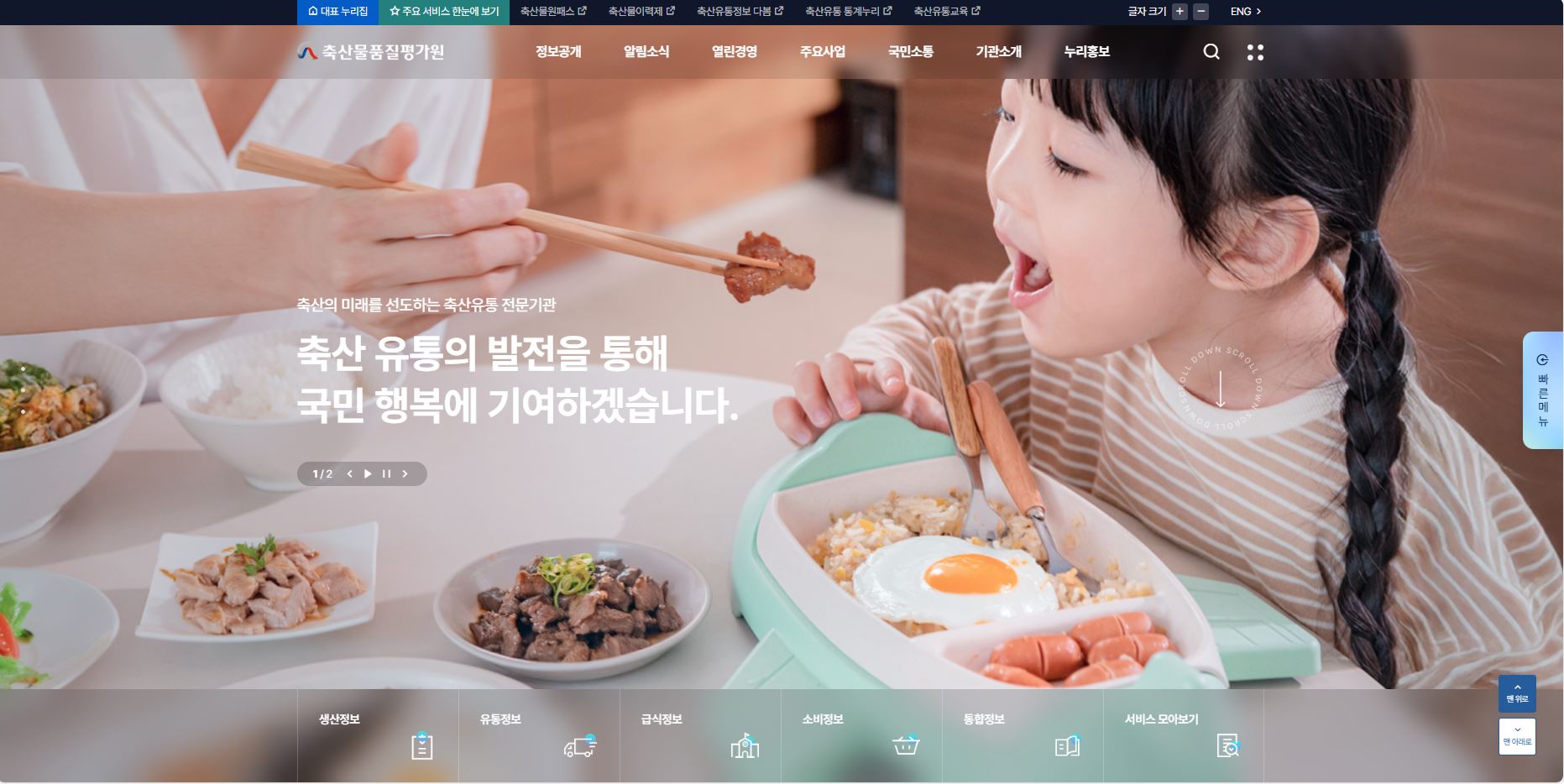 | 웹사이트 설명 | 축산물품질평가원 대표 누리집은 사용자 중심의 직관적인 정보 설계와 최신 웹 기술을 기반으로, 다양한 축산물 정보와 기관 서비스를 효과적으로 제공하는 공공 웹사이트입니다. 상단 비주얼 영역에는 주요 서비스를 사용자 유형별로 그룹화하여 배치함으로써 방문자가 자신의 목적에 맞는 정보를 빠르고 쉽게 찾을 수 있도록 구성하였습니다.
