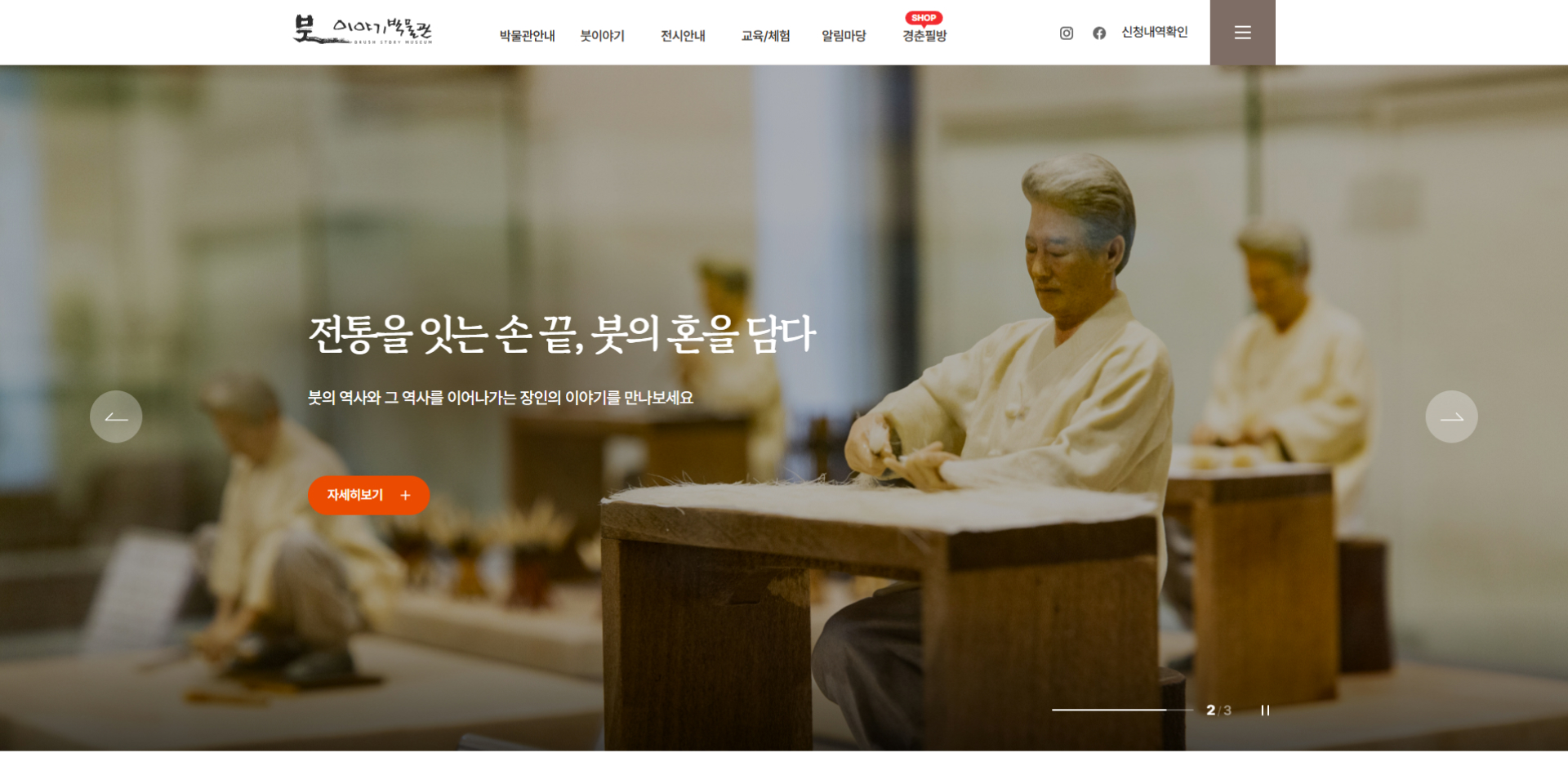 대관신청 및 프로그램 예약 등 실사용자 중심의 인터랙티브 기능 제공 감각적 디자인과 접근성·관리 효율성을 모두 고려한 구축 완성도 브랜드 아이덴티티와 기술적 안정성을 조화시킨 문화 플랫폼 모델 1. 기획 및 스토리텔링 ‘붓’이라는 전통 도구를 통해 예술적 가치와 장인정신을 전하는 박물관의 정체성을 온라인에서 재구성했습니다. 이번 리뉴얼은 단순한 기관 소개를 넘어, 붓의 역사·제작 과정·장인 이야기·체험 프로그램이 하나의 흐름 속에서 자연스럽게 연결되는 서사형 웹 내러티브 구조로 기획되었습니다. 사용자는 사이트를 탐색하며 붓의 미학적 세계와 더불어 ‘손끝의 문화’를 체험하도록 설계되었습니다. 2. 디자인(UI/UX) 디자인 콘셉트는 “먹빛의 여백, 붓의 선율”입니다. 한지 질감과 먹의 번짐을 모티프로 한 시각 언어를 사용해 정적인 전통의 미와 현대적 미니멀리즘을 조화시켰습니다. 스크롤 흐름에 따라 화면이 자연스럽게 전환되며, 붓의 움직임을 연상시키는 인터랙션을 구현했습니다. 또한 반응형 구조로 모바일, 태블릿, PC 등 다양한 디바이스에서 동일한 몰입감을 제공합니다. 3. 기능 및 사용자 참여 붓이야기박물관 리뉴얼의 핵심은 참여형 플랫폼입니다. 사용자가 직접 대관신청, 전시 및 교육 프로그램 예약, 체험 프로그램 일정 확인이 가능한 기능을 제공합니다. 관리자는 CMS를 통해 프로그램 일정, 전시장 이용 현황, 예약자 관리 등을 손쉽게 운영할 수 있어 오프라인과 온라인의 연계 운영 효율성을 높였습니다. 이로써 단순 정보제공을 넘어 실제 관람객이 참여·예약·소통하는 실질적 박물관 운영 플랫폼으로 진화했습니다. 4. 기술 구현 반응형 웹으로 구축되었으며,예약 시스템, 폼 자동 검증 및 알림 기능 등 실제 운영 효율성을 높이는 기능이 포함되었습니다. 또한 접근성 지침(명도 대비, 대체 텍스트, 시맨틱 구조)을 준수하여 모든 이용자가 편리하게 접근할 수 있도록 구현했습니다. 5. 콘텐츠 관리 및 확장성 전시 콘텐츠, 교육 자료, 작가 인터뷰, 보도자료 등 모든 항목은 CMS 기반으로 관리됩니다. 이를 통해 박물관 운영자가 지속적으로 콘텐츠를 확장·갱신할 수 있으며, 온라인 스토어, 기획전 소개와 손쉽게 연동할 수 있도록 구조화했습니다. 6. 브랜딩 및 아이덴티티 붓이야기박물관의 상징요소(붓, 한지, 먹빛)를 시각 시스템으로 정리하여 로고, 컬러, 서체, 인터랙션 전반에 일관된 아이덴티티를 구축했습니다. 브랜드의 핵심 가치인 **“정성·정중·정교”**를 시각적으로 표현해 전통문화기관으로서의 품격과 신뢰감을 강화했습니다. |