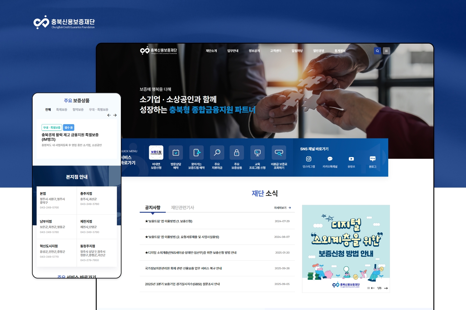 충북신용보증재단은 「보증에 행복을 더해 소기업·소상공인과 함께 성장하는 충북형 종합금융지원 파트너」라는 비전을 중심으로 웹사이트를 전면 리뉴얼하였습니다. 해당 개편은 신용보증 관련 지원자금 및 상품에 대한 안내·상담·신청 서비스를 온라인으로 손쉽게 이용할 수 있도록 사용자 접근성을 강화하는 데 목적을 두었습니다. 또한, 단순한 보증 서비스 안내를 넘어 소상공인을 위한 교육 지원, 건강검진 프로그램, 각종 정보공개 등 부가 서비스까지 통합적으로 제공함으로써 재단의 공공성과 신뢰도를 높였습니다. 기존 사이트의 정보 과부하 및 페이지 로딩 지연 문제를 개선하고, 콘텐츠 구조와 시각적 요소를 재정비하여 사용자가 보다 직관적이고 쾌적한 환경에서 웹사이트를 이용할 수 있도록 개선하였습니다. 이를 통해 충북신용보증재단은 도민과 기업이 함께 성장하는 지역 금융지원 플랫폼으로서의 역할을 강화하고자 하였습니다. [기획의도] 충북신용보증재단 웹사이트는 방대한 정보를 보다 효율적으로 전달하기 위해 가시성과 접근성을 극대화한 정보 구조 설계를 목표로 기획되었습니다. 기관의 신뢰성과 전문성을 기반으로, 이용자 중심의 정보 탐색 환경을 제공하는 데 중점을 두었습니다. 메인 화면에는 사용 빈도가 높은 주요 서비스를 퀵메뉴 형태로 전면 배치하여 즉각적인 접근성을 확보하고, 통합 검색 기능을 통해 이용자가 원하는 정보를 손쉽게 찾을 수 있도록 하였습니다. 또한, 방문상담 및 교육프로그램 신청 등 다양한 온라인 신청 기능을 구축하여 오프라인 중심이었던 업무를 비대면으로도 간편히 이용할 수 있게 개선했습니다. 추가로, 소상공인365 API를 연동한 상권정보시스템을 도입하여 지역 소상공인들이 실질적인 통계 정보를 얻을 수 있는 환경을 마련함으로써, 단순한 정보 제공을 넘어 실질적인 금융지원 플랫폼으로서의 역할을 강화하였습니다. [사이트 컨셉] 충북신용보증재단 웹사이트는 기관의 핵심 가치인 신뢰와 안정, 전문성을 시각적으로 구현하는 데 중점을 두었습니다. 로고의 주조색인 블루 컬러를 메인 톤으로 설정하여, 금융 공공기관으로서의 신뢰감과 청렴한 이미지를 강조하였으며, 이를 다양한 명도와 채도의 블루 톤으로 확장해 일관된 브랜드 아이덴티티를 구축했습니다. 메인 비주얼에는 소기업과 소상공인이 함께 성장하는 협력의 메시지를 상징적으로 표현하고, 넓은 여백과 명확한 정보 구획을 통해 사용자에게 안정적이고 직관적인 인터페이스를 제공합니다. 또한, 주요 서비스와 지원 정보를 아이콘 중심의 카드형 UI로 구성하여 정보 접근성을 높이고, 디지털 취약계층도 쉽게 이용할 수 있도록 가독성과 대비를 강화하였습니다. 전체적으로 복잡한 금융 정보를 단순화하고, 사용자 중심의 구조와 신뢰감 있는 비주얼 언어를 통해 ‘도민과 함께 성장하는 충북형 금융지원 플랫폼’이라는 브랜드 메시지를 명확히 전달하도록 디자인하였습니다. |