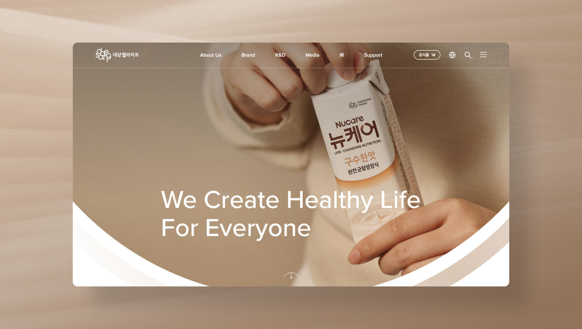 대상웰라이프는 국내 판매 1위 환자 균형영양식 뉴케어로 시작하여 생애주기와 라이프스타일에 맞춘 건강 솔루션을 제공하는 다양한 브랜드와 제품으로 확장해 왔습니다. 이번 웹사이트 리뉴얼을 통해 새롭게 정립한 브랜드와 기업 아이덴티티를 효과적으로 전달하고, 고객과 적극적으로 소통할 수 있는 플랫폼을 구축하고자 하였습니다. [컨셉] ‘생애주기’를 상징하는 Life Ring을 핵심 디자인 콘셉트로 설정하여 전반적으로 원형 이미지를 반영하였습니다. 브랜드별 주요 페이지에서는 컬러와 인터랙션을 통해 변화감과 역동성을 부여하는 동시에, 통일된 레이아웃을 적용해 전체적인 균형감을 유지했습니다. [특징] 고객 관점에서 필요한 정보를 분석하고 흐름에 맞게 정보 구조(IA)와 콘텐츠를 재정비하여 리뉴얼된 브랜드와 기업의 핵심 가치를 명확히 전달하였습니다. 전문성과 혁신 역량을 강조하기 위해 R&D 메뉴를 신설하고, 고객 맞춤형 제품 추천 기능인 'Wellife Solution'를 제공하여 대상웰라이프의 세로운 아이덴티티를 효과적으로 전달하였습니다. 기존의 적응형 구조에서 벗어나 PC, Tablet, Mobile 디바이스별 해상도에 최적화된 반응형으로 구축하였습니다. 반응형 환경에서도 일관된 디자인 콘셉트와 인터랙션을 유지하여 모든 기기에서 몰입감 있는 사용자 경험을 제공합니다. 더불어 대상웰라이프 공식 SNS와 대상웰라이프몰로 연결되는 바로가기를 정보 흐름상 적절한 위치에 배치하여 온드미디어와의 연결성을 강화했습니다. 특히 브랜드 소개 및 Wellife Solution과 같이 제품 관련성이 높은 페이지에서는 대상웰라이프몰 내 관련 카테고리로 직접 이동할 수 있는 버튼을 제공함으로써 고객이 브랜드 정보를 탐색하는 과정과 실제 제품 구매 과정이 매끄럽게 이어지도록 하였습니다. |