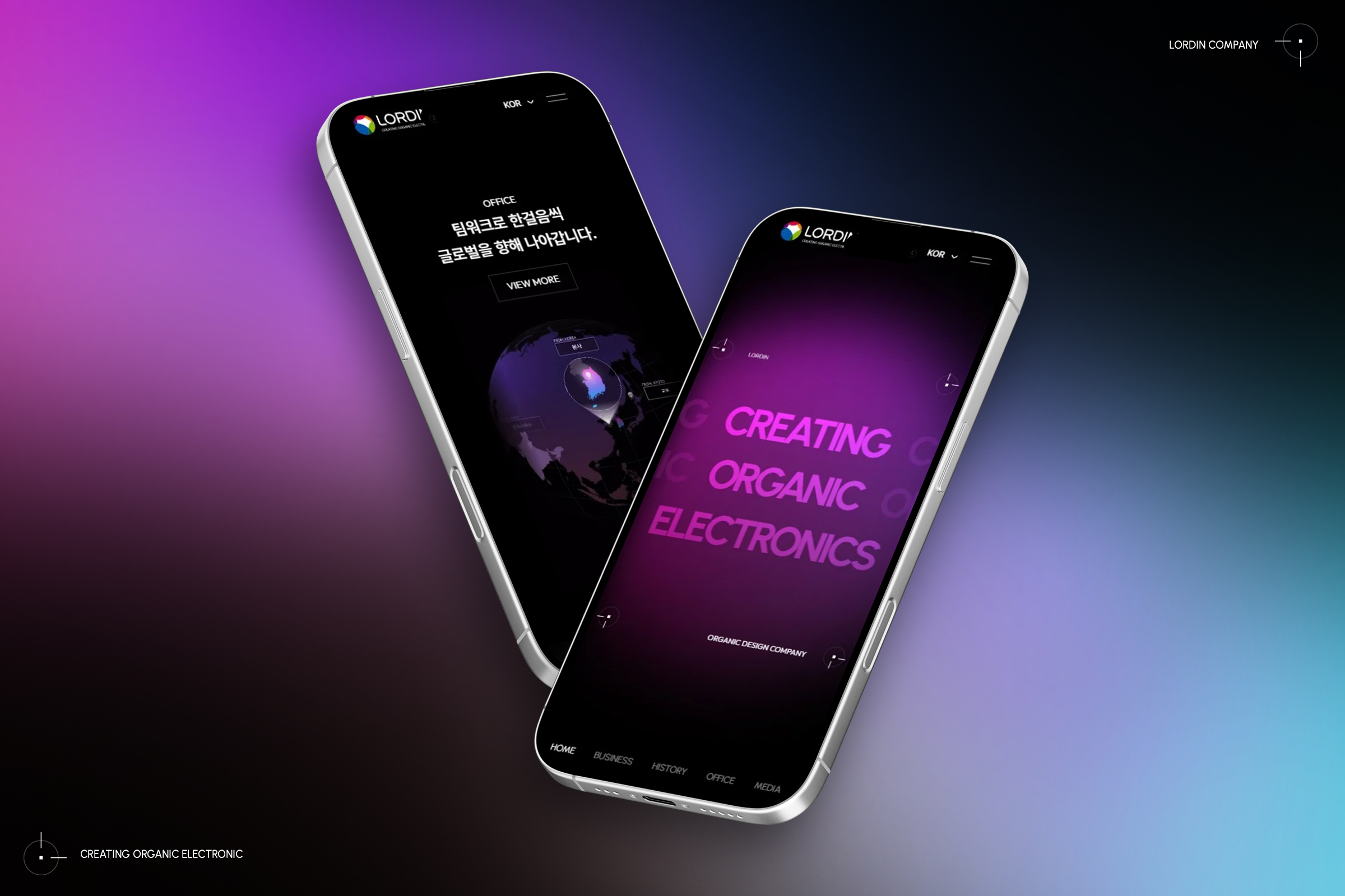로오딘은 OLED 디스플레이의 핵심 재료인 유기 전자 소재, 그중에서도 구현이 가장 까다로운 청색 인광 소재(Blue)의 효율성을 극대화하는 독보적인 기술력을 보유한 기업입니다. ‘빛의 삼원색(Red, Green, Blue)’이 조화를 이루어 다양한 색을 만들어내듯, 로오딘의 로고는 각기 다른 재능이 모여 새로운 가치를 창출한다는 브랜드 비전을 상징합니다. 이번 로오딘 웹사이트 구축 프로젝트는 이러한 기술력과 브랜드 철학을 디지털 공간에서 의미 있게 비쥬얼라이징하여 "오늘이 행복한 회사" 로오딘이 추가하는 첨단 기술 혁신과 따뜻한 인간 중심 가치의 공존을 감성적이면서도 기술력이 돋보이게 "기술과 감성의 공존"을 Key컨셉으로 기획하였습니다. 메인 인터랙션은 로오딘이 개발하는 청색 중심의 발광 소재를 미세한 도트 형태로 시각화하고, 이 도트들이 역동적으로 움직이며 하나의 구(球) 형태로 결집하는 과정을 통해 ‘다양한 인재들이 모여 혁신을 완성하는 로오딘’의 철학을 은유적으로 표현하여 BX(브랜드 경험)를 강화하였습니다. 사업분야를 소개하는 메인 컨텐츠 영역에서는 풀 비쥬얼 영상이 스크롤에 반응하여 디스플레이처럼 줄어드는 WebGL 인터랙션 모션 구현으로 Wow Ponit를 만들고자 하였고, 연혁 부분은 마치 조명이 비취는 듯한 장면을 연출하여 메인 컨셉인 "빛"을 일관성 있게 풀어냈으며, 글로벌로 성장하는 기업을 소개하는 영역에서는 유저가 지구본을 마우스로 회전시킬 수 있는 Three.JS 최신 기법 구현으로 재미요소를 더하여 기획하였습니다. 클라이언트의 니즈를 바탕으로 직접 제작한 3D 영상으로, OLED 소재의 핵심 속성인 ‘빛’과 ‘자발광’의 개념을 시각적으로 표현하는 데 초점을 맞추었고, RGB 컬러를 활용한 고감도 그래픽, 다양한 인터랙션을 통해 시각적 몰입감과 브랜드 상징성을 동시에 구현하고자 하였습니다. 모바일 편의성을 위해 모바일 메인페이지를 별도로 디자인하고 WebGL 소스 경량화, 하단 네비게이션 배치와 꼼꼼한 검수 테스트로 User-friendly 하게 제작하였습니다. [특징] 1. OLED 핵심 소재 기업으로서의 정체성을 시각적으로 표현하기 위해 '빛의 삼원색(RGB)'을 브랜드의 상징 요소로 활용하여 작업하였다. 2. 로오딘의 핵심 기술인 청색 발광 소재를 가루 형태의 도트 입자로 표현하고, 도트들이 역동적으로 움직이며 로오딘의 로고 심벌 모양으로 결집되는 3D를 직접 작업하여 콘텐츠 요소로 활용하여 브랜드의 기술력과 아이덴티티를 강조하고자 하였다. 3. 웹 표준 3D 그래픽 엔진인 Three.js를 활용하여 몰입형 인터랙션 경험을 제공하는 최신 웹 트렌드를 반영하였다. 4. 상징성과 직관성을 강화한 비주얼 아이덴티티를 통해 '로오딘 = 빛의 기술 기업'이라는 강한 인상을 남기도록 스토리텔링 기법을 활용하여 작업하였다. 5. 각각의 디바이스에 대응하기 위한 반응형으로 구축하여 사용자로 하여금 편리할 수 있도록 구축하였다. |
