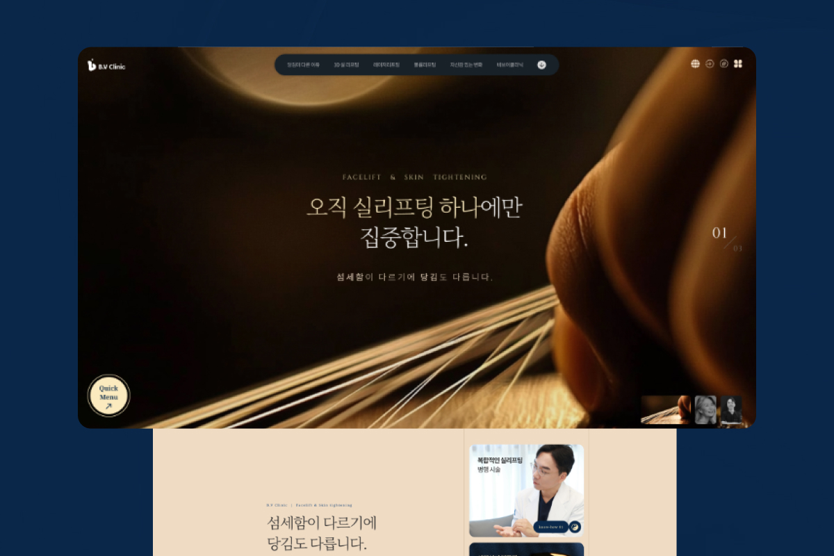비브이클리닉 공식 홈페이지는 개인 맞춤형 실리프팅과 스킨케어 프로그램을 전문으로 하는 병원의 전문성과 신뢰감, 고급스러움을 온라인상에서 효과적으로 전달하기 위해 제작되었습니다. 세련된 디자인과 직관적인 정보 구조를 통해 방문자가 진료 철학을 쉽게 이해할 수 있도록 구성했으며, 브랜드 이미지를 강화하고 상담 및 예약으로 자연스럽게 이어지도록 UX/UI를 최적화하였습니다. [제작 키워드] 고급스러움 베이지와 네이비 컬러의 조화를 통해 고급스럽고 차분한 브랜드 이미지를 구현하고, 병원의 프리미엄 이미지를 시각적으로 강화하였습니다. 신뢰감 의료진 비주얼과 함께 진료 철학, 전문성을 전면에 배치하여 방문 초반부터 안정적이고 신뢰도 높은 인상을 형성하였습니다. 사용자 경험(UX) 모바일·PC 등 다양한 환경에서 동일한 사용자 경험을 제공하며, 프로그램 탐색과 예약이 용이하도록 구성하였습니다. [차별성/특징] 1. 세련된 비주얼 중심의 UI 구성 비브이클리닉 홈페이지는 첫 화면에서부터 의료진 이미지와 핵심 진료 프로그램을 배치하여 ‘신뢰’와 ‘전문성’을 직관적으로 전달합니다. 전체 레이아웃은 불필요한 시각 요소를 최소화하고, 병원의 철학과 주요 진료 영역이 한눈에 들어오도록 설계되었습니다. 또한, 메인 페이지에서 각 프로그램별 상세 페이지로 자연스럽게 이동할 수 있는 카드형 인터페이스를 적용하여, 사용자가 원하는 정보를 빠르게 탐색할 수 있도록 하였습니다. 2. 일관된 브랜드 톤앤매너 컬러 팔레트는 베이지와 네이비를 메인으로 설정해 고급스럽고 안정적인 인상을 주며, 모든 서브페이지에서 통일된 비주얼 언어를 유지했습니다. 글씨체, 간격, 버튼 스타일 등 세부 디자인 요소까지 통합 가이드라인을 적용해 브랜드 정체성과 관리 편의성을 동시에 확보했습니다. 3. 모바일 최적화 UX 설계 비브이클리닉 홈페이지는 모바일 기기에서도 데스크탑과 동일한 비주얼 경험을 제공하도록 설계되었습니다. 손가락 터치 중심의 인터랙션을 고려해 주요 기능(예약, 프로그램 이동, 문의 등)을 간결한 버튼 구조로 구성했으며, 부드러운 애니메이션 효과를 통해 사용자 피로도를 줄이면서도 브랜드의 감각적인 이미지를 강화했습니다. [결과] 비브이클리닉의 새로운 홈페이지는 단순한 정보 전달을 넘어, ‘프리미엄 시술의 가치와 신뢰’를 전달하는 디지털 브랜딩 플랫폼으로 완성되었습니다. 오월의나무컴퍼니는 비브이클리닉이 가진 섬세한 진료 철학과 차별화된 치료 프로그램을 웹사이트 안에서 직관적으로 느낄 수 있도록 설계했으며, 향후 브랜드 확장성과 마케팅 효율성까지 고려한 구조로 제작하였습니다. |
