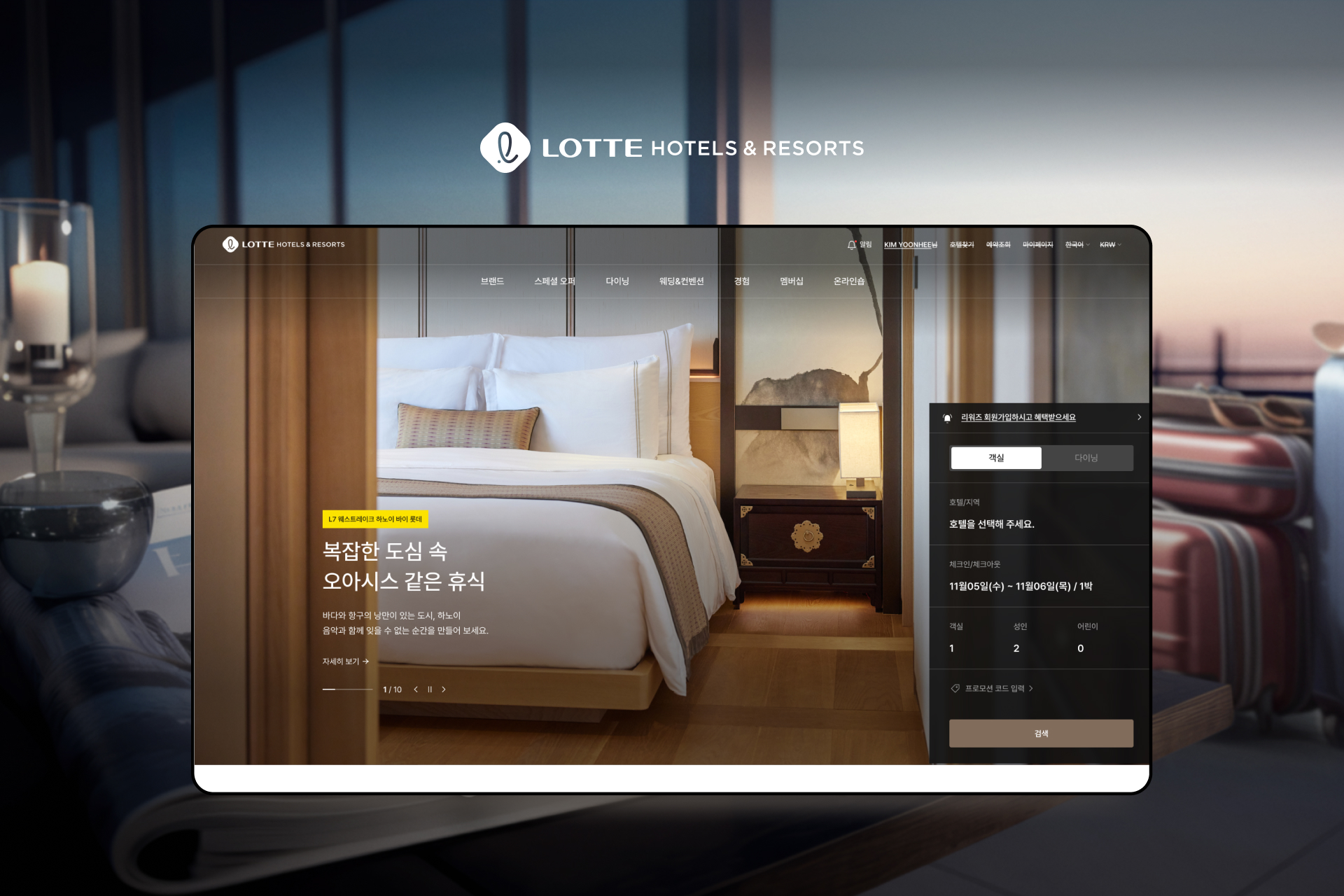 글로벌 체인 확장을 위한 기술적 대전환, 사용자의 손끝에 닿는 경험을 바꾸는 디자인, 그리고 내부 운영자들이 더 빠르게 반영할 수 있는 관리자 시스템까지. 이번 리뉴얼은 그 어느 때보다 복합적인 도전이었다. “왜 바꿔야 했을까?”로 시작, “앞으로 어떻게 더 잘 쓸 수 있을까?”라는 질문이 모든 단계에서 관통하는 이번 프로젝트는 고객의 사용 편의성 증대, 서비스의 확장성을 고려한 설계, 마케팅 플랫폼으로서의 역할 강화를 목적으로 진행하였다. 온라인 회원체계를 재정의하여 유의미한 정보 기반의 마케팅 활동 및 개인화 서비스를 강화하였고, 식음 예약을 포함한 통합 예약 서비스로 프로세스를 개선하였고, 기존의 예약 프로세스 UI/UX 개선은 물론 온라인 결제 기능을 신규로 구축하여 온라인 완결형 서비스로서 역할에 집중하였다. 디자인 및 UI/UX 롯데호텔은 하나의 브랜드가 아닌 4개의 브랜드로 구성되어 있다. 제휴를 포함하여 글로벌 확장이라는 과제를 그룹사 목표로 선언한 시점에서 ‘시그니엘, 롯데호텔, 롯데시티호텔, L7’의 브랜드 별 차별성을 명료하게 제공하는 것을 목표로 타깃, 특화콘텐츠와 체인별 콘텐츠 우선순위, 톤앤매너를 개별 정의하는 과정을 통해 통합 마케팅채널과 브랜드 별 메인으로 구분하여 진행하였다. 단순한 화면 UI 개선을 위한 설계와 디자인이 아닌 글로벌 가이드를 기반으로 각 브랜드의 고유의 아이덴티티와 차별화된 가치 전달을 통해 전혀 다른 경험을 제공하고자 하였고, 단순히 ‘보는 디자인’이 아니라, 사용자가 직접 움직이게 하는 ‘행동을 유도하는’ 디자인을 지향했습니다. 브랜드마다 고유한 정체성과 컬러, 폰트, 모티프 오브젝트를 활용하여, 서비스 진입 즉시 “이 브랜드는 무엇인가”를 인지할 수 있도록 방향성을 수립했고 적극적인 인터랙션 적용으로 콘텐츠의 몰입도를 확장하고자 했습니다. 주요특징 브랜딩, 개인화, 통합예약, 프로모션 등 글로벌 마케팅 플랫폼으로서 다양한 고객의 요구에 부합하는 기능과 서비스가 총망라되어있다. 눈에 보이는 기능과 서비스 외 개발 전과정에서 핵심과제로 수행한 부분은 성능 개선이었다. 초기화면 로딩속도와 예약 프로세스 진행 시 로딩속도 확보는 프로젝트 성공을 위한 핵심과제였다. 끈임없는 테스트와 성능 최적화를 통해 기존 서비스 대비 월등히 높아진 속도를 경험할 수 있다. |