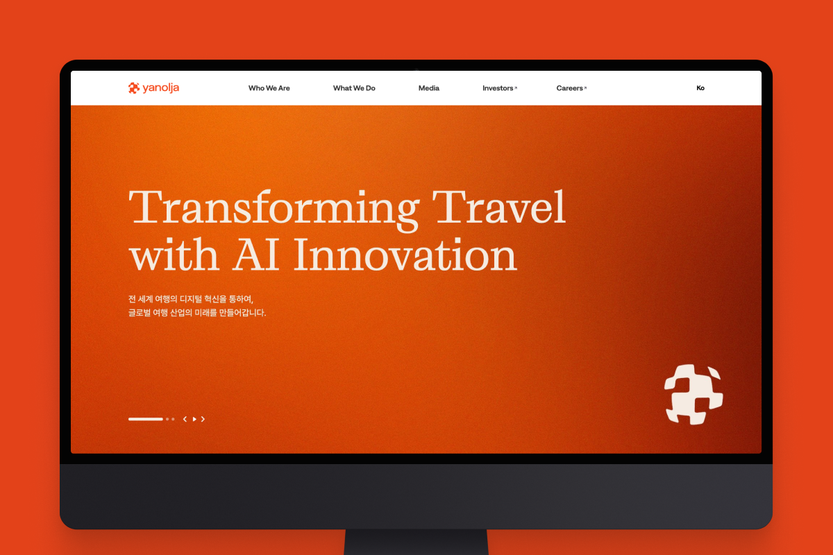 | 웹사이트 설명 | 야놀자 그룹의 공식 글로벌 웹사이트는 'Global travel technology company'로 도약하는 기업의 새로운 브랜드 아이덴티티와 사업을 전달하는 핵심 디지털 허브입니다. 전 세계 여행사업자와 여행자를 대상으로 데이터를 기반으로 한 기술력을 직관적으로 전달하기 위해 최고 수준의 사용자 경험(UX/UI)을 구현했습니다.