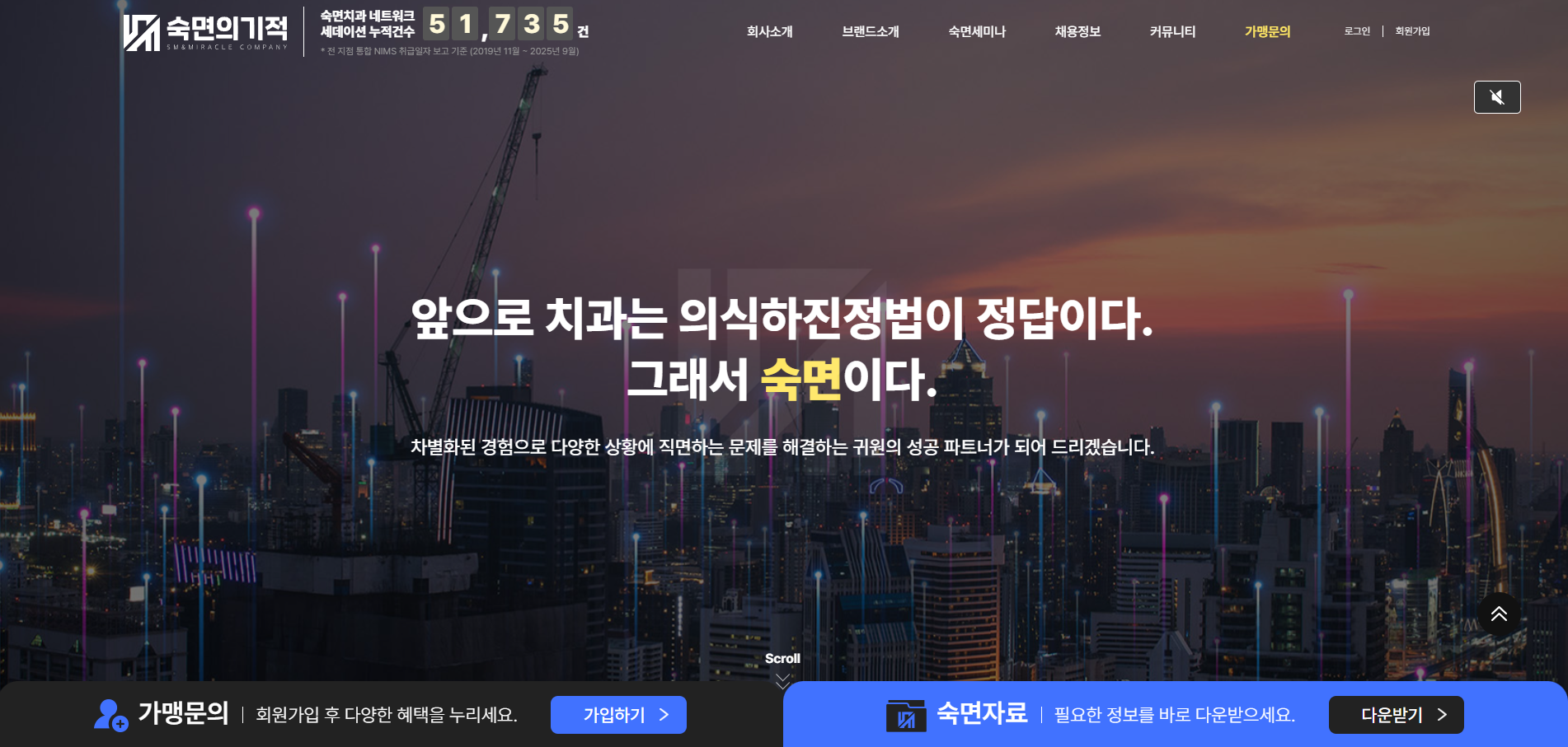 - 치과치료에 대한 두려움 없이 자는듯 편안한 치과 숙면의 기적은 의식하진정법(세데이션)을 통해 치과 진료에 대한 불안과 공포를 근본적으로 해결하고자 하는 치과 진료 문화 혁신 브랜드의 정체성을 담고 있습니다. 이는 단순 진료 기술을 넘어, 치과 경험(Experience) 전체를 설계하는 새로운 패러다임입니다. [목적] 단순한 홍보용 홈페이지가 아닌, 브랜드 철학, 실제경험 기반의 높은 신뢰도의 환자 대처법, 치과 운영 노하우, 네트워크 확장으로 이어지는 의료 비즈니스 생태계 플랫폼으로 설계되었습니다. 방문자는 홈페이지를 접하면서 [진료], [경영], [교육] 을 아우르는 의료 혁신 기관 이라는 메시지를 자연스럽게 경험합니다. [디자인] 숙면의 기적 UI/UX는 치과관계자들의 세데이션에 대한 안심과 신뢰를 기반에 두고 제작했습니다. - 부드러운 곡선형 레이아웃과 신뢰감을 주는 블랙,블루 퍼스널 색상 및 핵심 키워드에 포커싱을 위한 파스텔 옐로우 - 실제 결과기반 데이터를 열람 가능한 시각 정보로 구성 - 복잡한 설명이 아닌 감정적인 공감 및 논리적 신뢰가 전달되는 구조 [플랫폼 지원] 숙면의 기적은 치과 운영 및 의료진의 실전형 지원 시스템을 제공합니다. - 세미나 & 교육 : 진료법, CS, 직원 교육 - 가맹 네트워크 : 브랜드 가맹신청, 성공사례, 전략공유 - 자료 아카이브 : 실무 노하우, 환자 응급시 대처법, 운영 메뉴얼 제공 숙면의 기적은 치과진료(의료) + 병원 경영(비즈니스) + 교육(지식 확산)을 하나의 통합된 웹 경험 시스템으로 연결했습니다. 홈페이지 방문자는 세데이션의 안정성과 신뢰감을 느끼도록 몰입력을 높이며, 브랜드의 가치를 체감하게하는 의료 브랜드의 문화 자체를 설계하는 디지털 플랫폼입니다. |