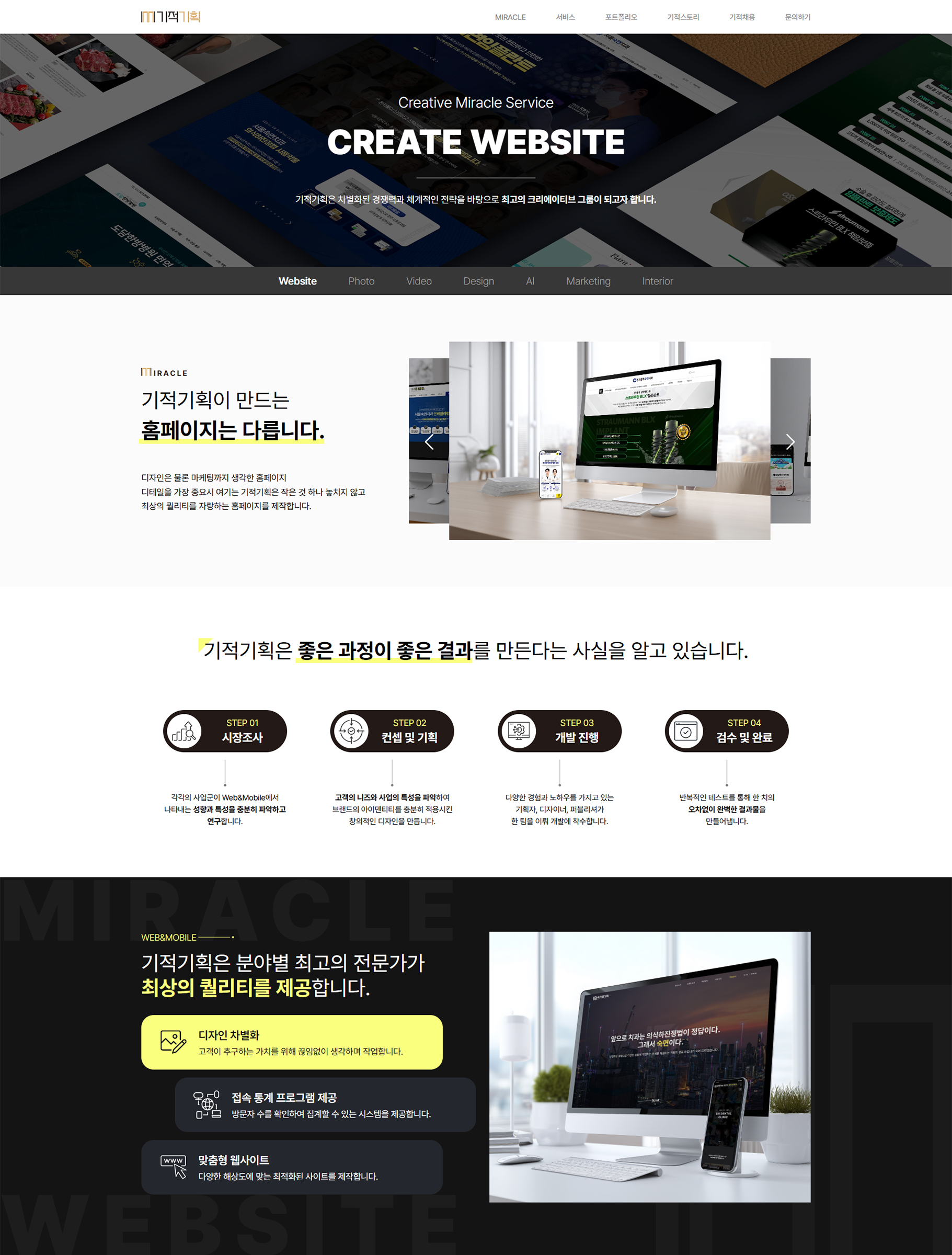 기적기획은 다양한 플랫폼을 아우르는 종합 크리에이티브 에이전시로서, 첫 화면 비주얼을 통해 “새로운 트렌드를 만드는 기적”이라는 브랜드 철학을 즉각적으로 전달합니다. ‘MIRACLE’ 카테고리에서는 ISO·벤처기업·Inno-Biz 인증 등 성장 과정을 제시해 브랜드 신뢰도를 높였습니다. 또한 조직도 소개 페이지를 통해 기획부터 디자인, 영상, AI, 마케팅까지 하나의 흐름으로 이어지는 토탈 크리에이티브 솔루션을 제공한다는 메시지를 명확히 전달합니다. 포트폴리오에서는 디자인·사진·홈페이지·AI·영상 등 다양한 실제 작업 사례를 시각적으로 제시해 전문성과 스타일을 직관적으로 보여줍니다. ‘기적 스토리’는 브랜드의 내면적 가치와 기업 문화를 전달하기 위해 기획 브랜딩 페이지로, 사용자 체류시간과 브랜드 몰입도를 높이는 전략적 콘텐츠로 기획되었습니다. [ 디자인 ] 기적기획의 홈페이지는 사용자 경험(UI/UX)을 중심으로 설계된 콘텐츠 중심의 구조적 미니멀리즘 디자인을 기반으로 합니다. 불필요한 장식을 최소화하고, 브랜드의 핵심 메시지가 시각적 위계 안에서 자연스럽게 전달되도록 구성하여 사용자가 브랜드의 콘텐츠를 빠르고 명확하게 이해할 수 있도록 하였습니다. 통일된 브랜드 컬러 시스템과 가독성이 높은 타이포그래피를 적용해 브랜드 아이덴티티를 강화하고, 일관된 시각 언어를 통해 신뢰도와 인지도를 높였습니다. 또한 섹션별 이미지, 그래픽, 모션을 활용해 브랜드 감성을 시각적으로 표현하였으며, 사용자는 페이지 흐름 속에서 브랜드의 가치와 철학을 자연스럽게 경험하도록 디자인되었습니다. [ 서비스 ] 기적기획은 기획부터 디자인, 개발, 마케팅까지 전 과정을 아우르는 토탈 크리에이티브 솔루션을 제공합니다. Website 부문은 전략적 기획을 바탕으로 반응형 웹사이트와 브랜드 사이트를 구축하고, Photo·Video 부문은 인물·제품 촬영부터 프로모션 영상·모션그래픽 제작까지 수행해 콘텐츠의 완성도를 높입니다. Design 부문은 로고·패키지·편집물 등 다양한 디자인으로 기업의 비전과 경쟁력을 시각화하며, AI 부문은 모델·영상·공간 콘텐츠를 통해 미래지향적인 브랜드 이미지를 강화합니다. 또한 Marketing을 통해 제작 이후의 성과까지 연결하고, Interior 부문은 트렌드에 맞춘 공간 디자인으로 온·오프라인을 아우르는 통합 브랜딩을 완성합니다. 이처럼 모든 서비스는 “브랜딩 → 제작 → 마케팅”의 유기적 흐름 속에서 고객이 브랜드 가치를 한 번에 실현할 수 있도록 구성되었습니다. [주요 특징] 기적기획은 심플한 구조 속에서도 콘텐츠의 흐름과 위계를 명확히 정리하여, 사용자가 브랜드의 아이덴티티를 직관적으로 체감할 수 있도록 설계되었습니다. 통일된 컬러 시스템과 정제된 그래픽 모션을 통해 브랜드의 감성과 전문성을 한층 강화하고, 브랜딩 경험을 제공하는 감각적이고 전략적인 크리에이티브 플랫폼으로 완성되었습니다. |