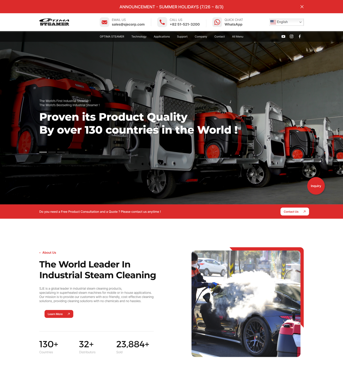 | 웹사이트 설명 | 산업용 스팀 세척기 분야의 글로벌 리더 SJE Corporation의 브랜드 경쟁력과 기술 신뢰도를 극대화하고,해외 바이어·디스트리뷰터·산업 고객과의 원활한 커뮤니케이션을 강화하기 위해 제작된 웹사이트입니다.