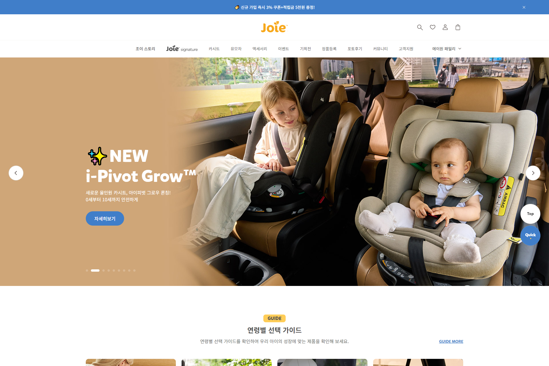 에이원 공식 쇼핑몰은 리안(RYAN), 조이(Joie) 등 국내외에서 인정받은 프리미엄 유아 브랜드의 유모차, 카시트, 아기침대, 유아가구, 출산용품에 이르기까지, 아이의 안전과 성장에 꼭 필요한 엄선된 제품만을 선보입니다. 해당 쇼핑몰은 쇼핑몰 조이 입니다. 카페24 솔루션을 기반으로 구축되어, 고객님들이 PC와 모바일 웹 어디서든 편리하고 안정적인 쇼핑 경험을 누리실 수 있도록 최적화되어 있습니다. |