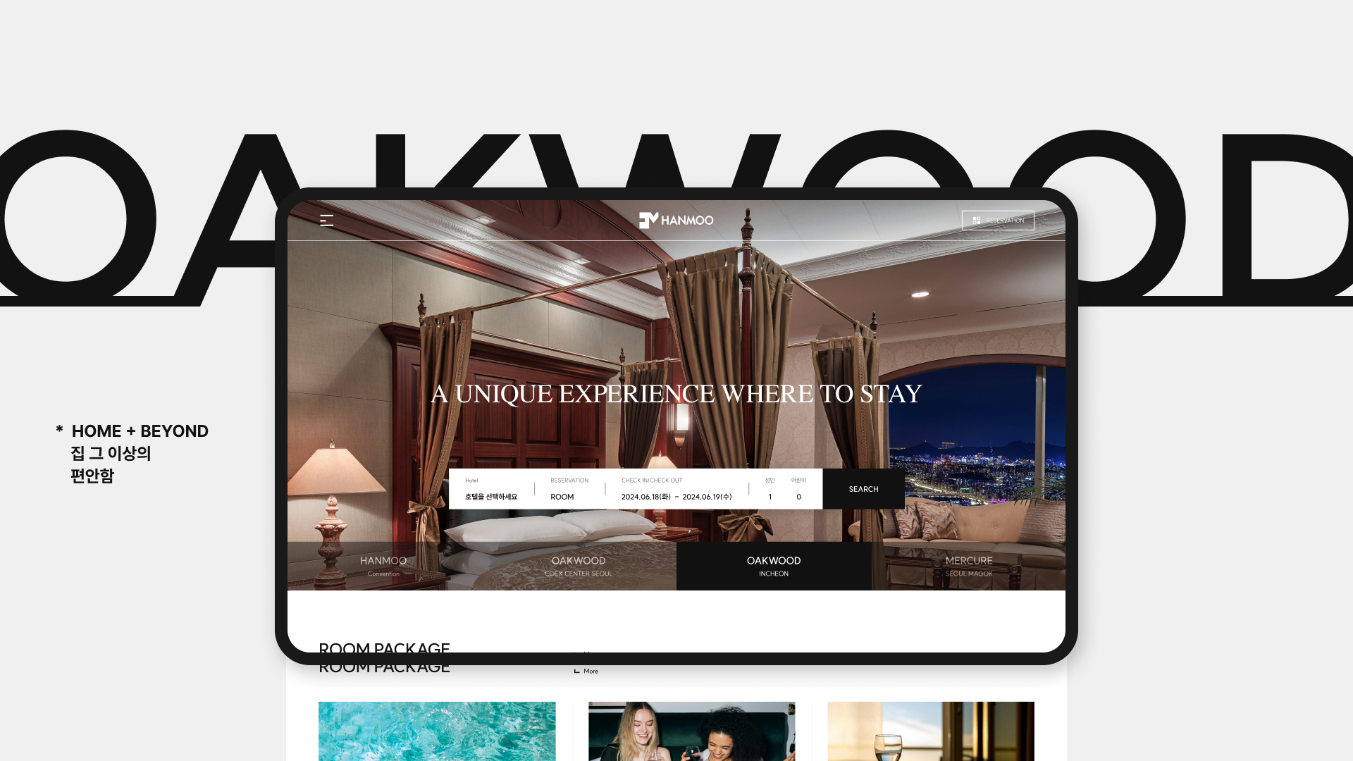 | 웹사이트 설명 | 기존에 분산되어 있던 한무 컨벤션의 호텔들을 모아 CMS 기반으로 통합하여 오크우드 코엑스 , 송도 및 마곡 머큐어 호텔까지 한 곳에서 예약하고 콘텐츠를 즐길 수 있도록 허브 페이지를 만들었습니다 . 허브 페이지를 통해 각각의 호텔 에약 사이트로 이동 가능하며 한 곳에서 전체 프로모션 정보를 습득할 수 있습니다 . 도시속에 위치한 호텔인 만큼 가볍지 않고 고급스러우면서도 비즈니스 고객과 일반 고객들이 모두 선호 할 수 있는 컨셉으로 구성 하였습니다 .
