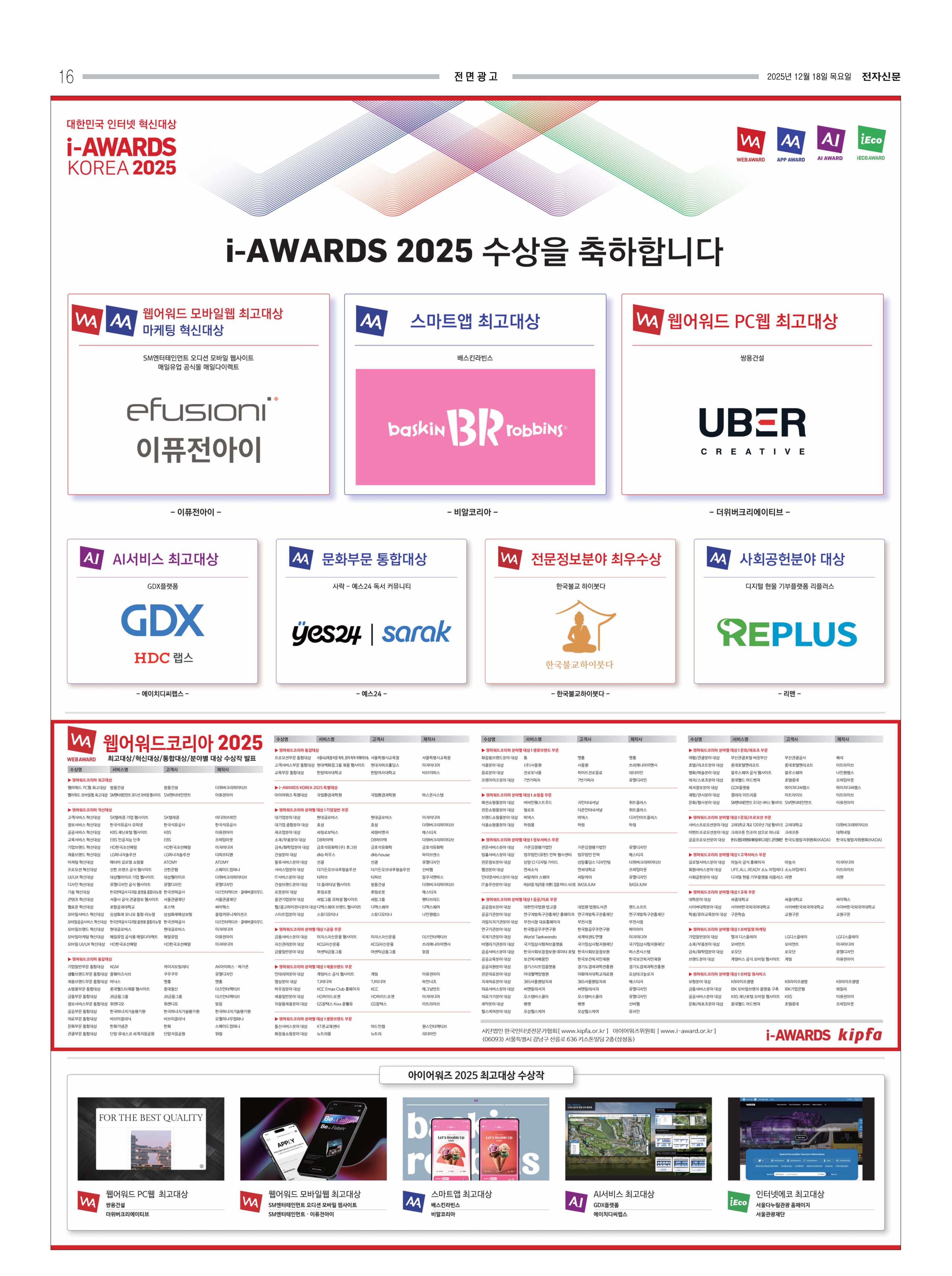 아이어워즈 2025의 수상축하 통합광고를 12월 18일 매일경제 및 전자신문 지면을 통해 진행하였습니다.