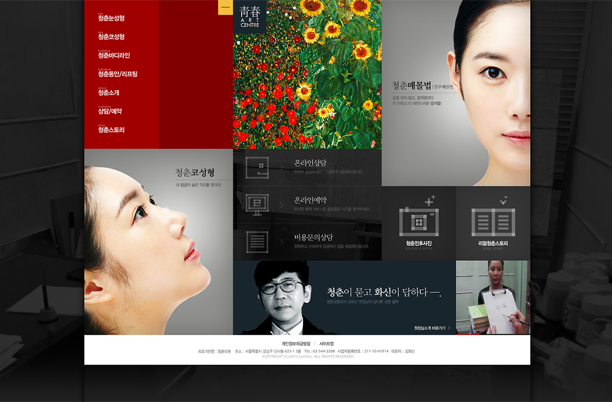 성형외과지만 그림을 그리는 작가이기도 하신 원장님을 모티브로 최대한 성형외과 홈페이지의 느낌을 벗어나고자 하였습니다. 마치 하나의 갤러리를 보는 듯한 느낌을 표현하는데 주안점을 두고 제작하였습니다. [기획의도] 일반적으로 홈페이지하면 네비게이션, 비주얼, 컨텐츠로 레이아웃이 나누어져 있는게 보통입니다. 청춘성형외과는 네비게이션과 비주얼, 컨텐츠의 영역을 허물고 메인 전체를 네비게이션으로 활용해보았습니다. 사이트의 뒷 배경은 청춘성형외과 내부인테리어를 활용했습니다 [특징(조형, 기능, 사용성 등 구체기술)] 가장 큰 장점은 주요 메뉴들을 메인에서 바로 접근 할 수 있어 사용자 접근성이 우수하다는 점 입니다. 왠만한 주요 메뉴들은 메인에서 바로 접근 할 수 있지만 노출되지 않은 메뉴들은 왼쪽 menu open을 클릭하면 확장 된 네비게이션으로 2depth까지 나타납니다. 또 하나의 장점은 청춘성형외과 대표 시술인 눈성형에 마우스오버를 하면 2depth까지 메인에서 바로 이동 할 수 있다는 것 입니다. 눈성형이 대표 시술이긴 하나 코성형도 전혀 배제 할 수 없는 시술이므로 눈성형과 같은 비중으로 노출하였고 구현방식 또한 동일합니다. 중앙에 靑春,Art Centre의 디자인은 강화신 원장님의 작품으로 구성 될 예정이며, 여러 작품을 사이트 접속 시 마다 렌덤하게 나타낼수도 있습니다. 그 밖에 강화신 원장님의 진료과정 같은 것을 촬영해서 동영상 영역으로도 활용 가능하도록 구성하였습니다. |