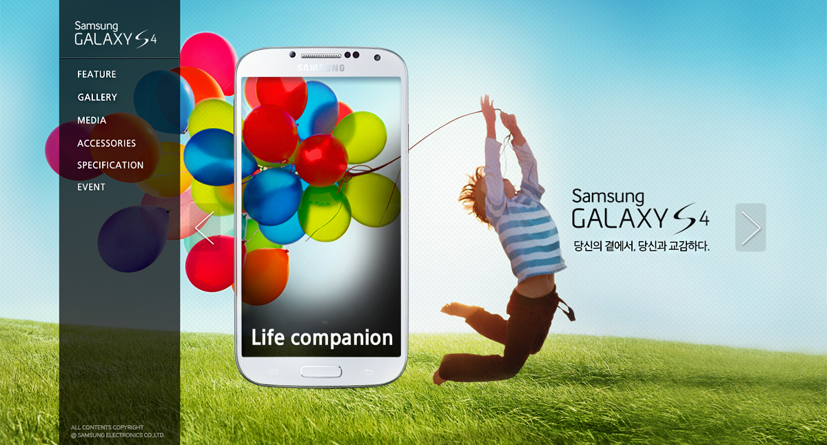 삼성 갤럭시 S4의 브랜드 컨셉인 Life Companion과 브랜드 슬로건인 '당신의 곁에서, 당신과 교감하다'를 전체 사이트의 테마로 선정하여 제작된 공식 브랜드 웹사이트. 브랜드가 말하고자 하는 컨셉과 슬로건을 소비자들이 사이트를 통해 느낄 수 있도록 감성적인 분위기의 이미지를 중심으로 활용하여 디자인 하였으며, 기계적이고 차가운 느낌의 비주얼을 최소화하여 기존의 제품 스펙과 외관 중심의 휴대폰 사이트와 차별화했다. 각각의 페이지들은 마치 잡지를 보는 느낌을 줄 수 있도록 많은 텍스트보다는 제품의 기능을 설명하는 1~2장 정도의 이미지로 구성하여 소비자들이 제품에 대한 기능을 자세하게 읽지 않고도 제품 기능을 확실하게 인지할 수 있도록 구성 하였다. 또한 제품을 설명하는 페이지는 각 페이지별로 SNS 공유 기능을 삽입하여 제품의 특장점이 개별적으로 확산될 수 있는 장치를 마련하였다. 삼성 갤럭시 S4의 브랜드 웹사이트는 웹뿐만 아니라 모바일 사이트도 웹접근성을 준수하여 제작되었다. |